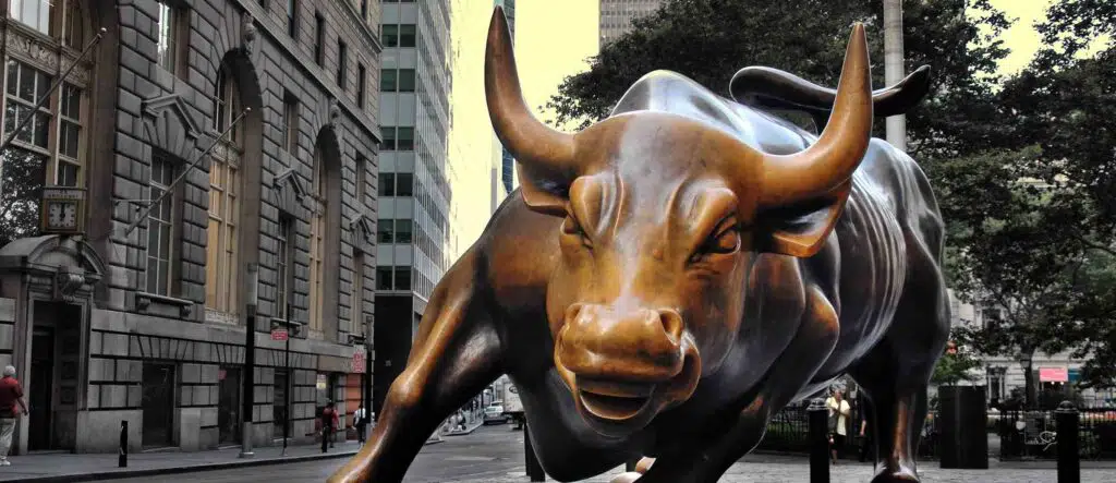 Bullish nada mais é do que o movimento de alta antecedido por um de baixa. Uma ação de baixo para cima, caracterizada pelo movimento usado pelo touro com os chifres, o que explica a expressão. Já que em tradução livre, bull corresponde a touro. Além disso, existe também o Charging Bull, famosa escultura de um touro feita de bronze na Wall Street.